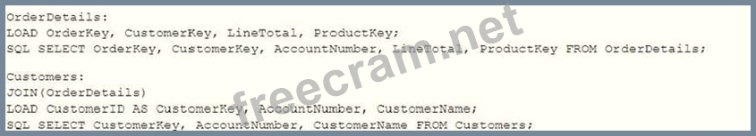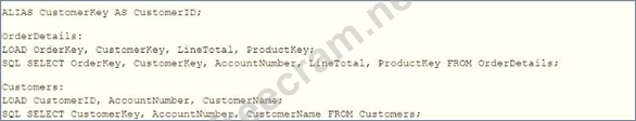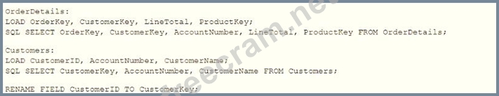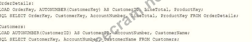 A data architect is loading two tables into a data model from a SQL database. These tables are related on key fields CustomerlD and CustomerKey. Which scripts should be used to load the data while maintaining the correct associations? A) B) C) D)