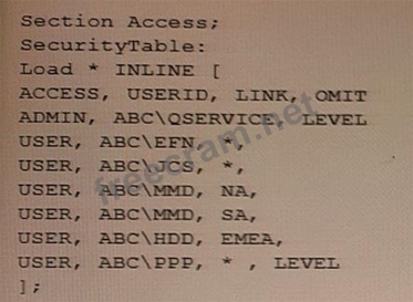 The Section Access security table for an app is shown. User ABC\PPP opens a Qlik Sense app with a table using the field called LEVEL on one of the table columns.