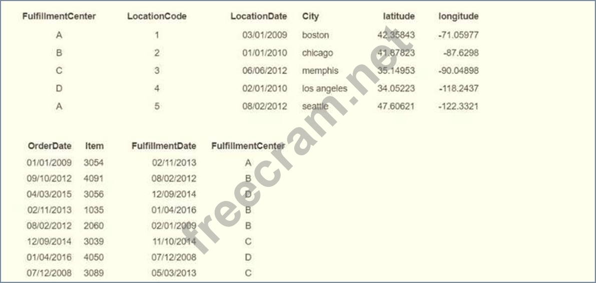 Explanation In this scenario, the data architect needs to track the history of order fulfillment centers on a per center, per location basis. This means that the data architect needs to match the historical order fulfillment center data with the current order fulfillment center data, based on the center and location. The ApplyMap function allows you to create a mapping between the data in one table and the data in another table, based on a common field. The data architect can use ApplyMap to create a mapping between the historical order fulfillment center data and the current order fulfillment center data, based on the center and location fields.