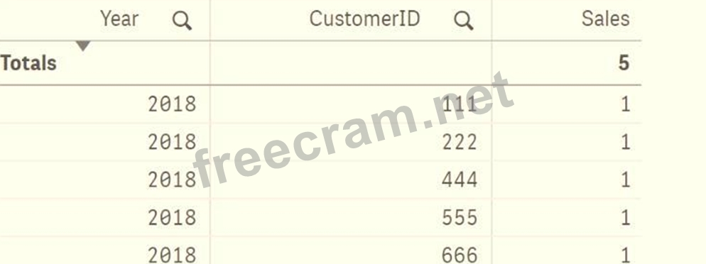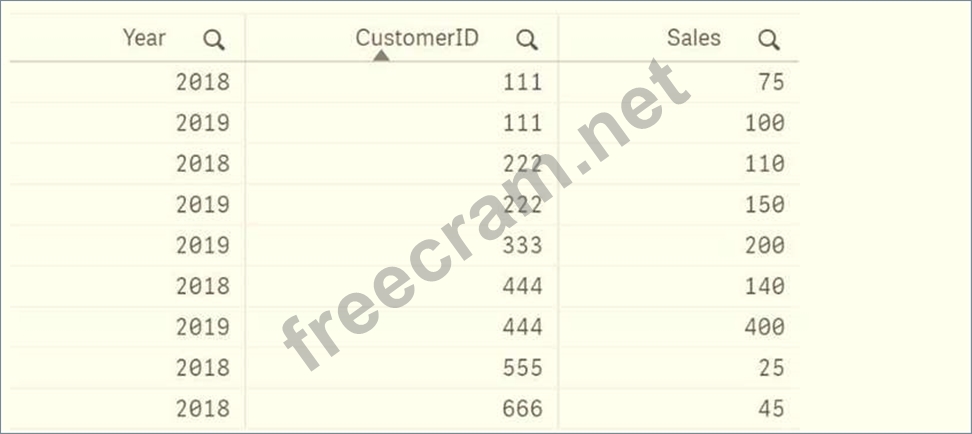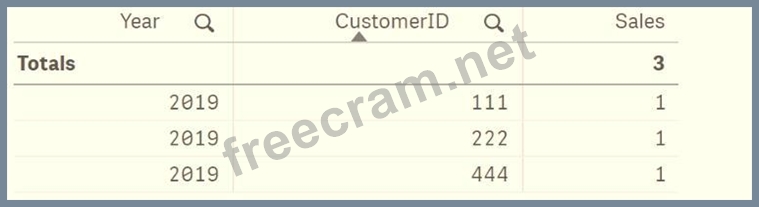Refer to the exhibit. A data architect loads sales data and creates a table which shows only customers who made purchases in 2018 and 2019. The data architect applies the following set analysis expression on the sales measure. Count<{<Year={'2 018'}, CustomerID=P({<Year={'2019*}>})>} Customer ID) Which option shows the resulting table after the expression is applied? A) B) C) D)