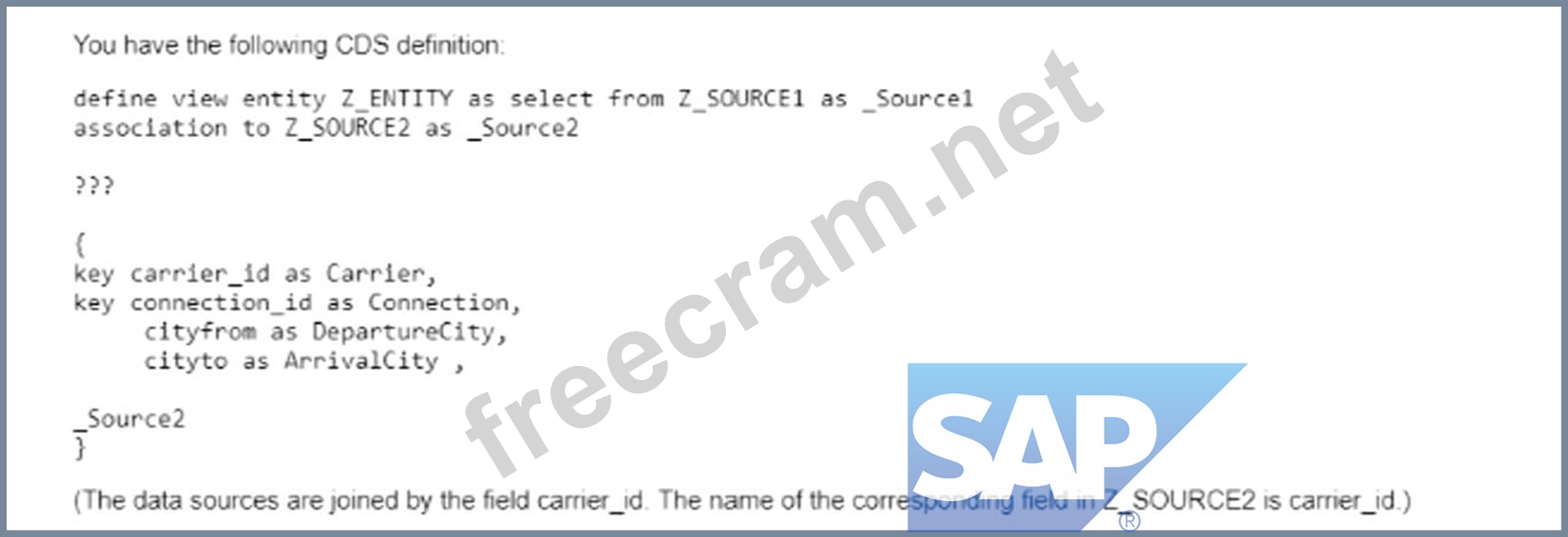 Explanation The correct ON condition that must be inserted in place of "???" is: ON Sprojection.carrier_id=Z_Source2.carrier_id This ON condition specifies the join condition between the CDS view Sprojection and the database table Z_Source2. The join condition is based on the field carrier_id, which is the primary key of both the CDS view and the database table. The ON condition ensures that only the records that have the same value for the carrier_id field are joined together1. The other options are not valid ON conditions, because: A: ON Z_Sourcel.camer_id = 7_Source2 carrier_id is not valid because Z_Sourcel and 7_Source2 are not valid data sources in the given code. There is no CDS view or database table named Z_Sourcel or 7_Source2. The correct names are Z_Source1 and Z_Source2. Moreover, the field camer_id is not a valid field in the given code. There is no field named camer_id in any of the data sources. The correct name is carrier_id. B: ON Sprojection Camer=Source2 carrier_id is not valid because Sprojection and Source2 are not valid data sources in the given code. There is no CDS view or database table named Sprojection or Source2. The correct names are Sprojection and Z_Source2. Moreover, the field Camer is not a valid field in the given code. There is no field named Camer in any of the data sources. The correct name is carrier_id. Furthermore, the ON condition is missing the dot (.) operator between the data source name and the field name, which is required to access the fields of the data source1. C: ON Sprojection. Carrier Source2.carrier is not valid because Carrier and carrier are not valid fields in the given code. There is no field named Carrier or carrier in any of the data sources. The correct name is carrier_id. Moreover, the ON condition is missing the dot (.) operator between the data source name and the field name, which is required to access the fields of the data source1. References: 1: ON Condition - ABAP Keyword Documentation
