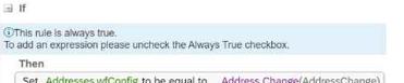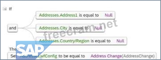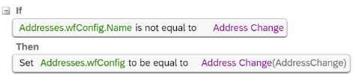 Your customer would like to automate its company's HR transactions. This includes auto-populating fields to reduce data entry errors and automating approvals during self-service transactions. You are asked to create the following rules based on your customer's requirements: * Three event reason derivation rules (ERD1, ERD2, ERD3) * A separate catch-all event reason derivation rule (ERD-Catch) * A workflow derivation rule based on event reasons (WFD) * A rule to auto-populate the Job Title. Pay Grade, and Employee Class field values in the Job Information whenever the job code is changed (Defauit_JobClass) * A rule to use AddressChange workflow for any address change requests (WFD_Address) * A cross-entity rule to auto-calculate the Base_Salary amount based on ) changes to the FTE value for any event other than Hire or Rehire (Joblnfo_FTE_Comp) Answer the questions to ensure the event reasons and workflow rules adhere to SAP SuccessFactors recommended practices. Which clause meets the WFD_Address rule requirement?