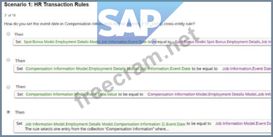 To set theevent datein Compensation Information for theJobinfo_FTE_Compcross-entity rule,Option Dis the correct method. The approach ensures that the Event Date field in the Compensation Information section aligns with the Event Date in Job Information. This synchronization is crucial for maintaining consistency in effective dates across entities during HR transactions. Scenario 1: HR Transaction Rules