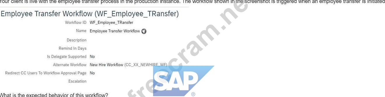 Your client is live with the employee transfer process in the production instance. The workflow shown in the screenshot is triggered when an employee transfer is initiated. What is the expected behavior of this workflow?
