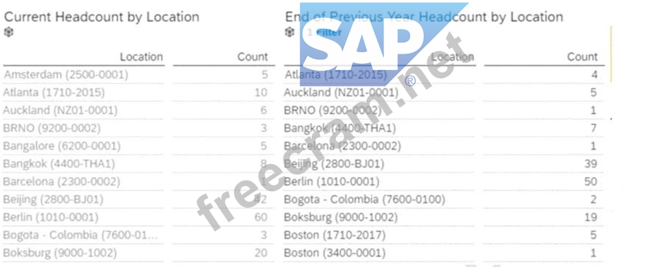 The data source used by the two tables only displays current (active) employees. How would you configure a filter on the table End of Previous Year Headcount by Location to display data accurately? Note: There are 2 correct answers to this question.