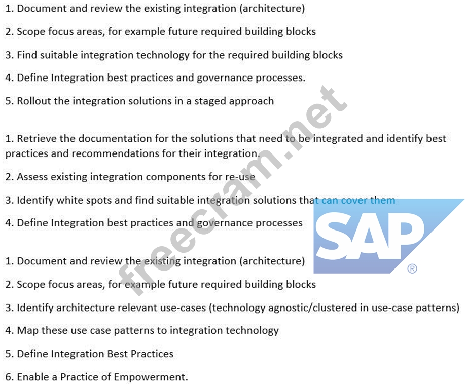 Option A is not correct because it does not include identifying architecture relevant use-cases (technology agnostic/clustered in use-case patterns), which is a key step to define and categorize the integration requirements in a generic way. It also does not include enabling a practice of empowerment, which is a key step to ensure the success and sustainability of the integration project.