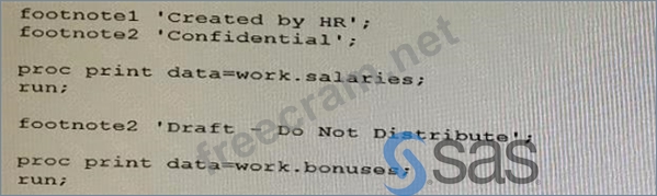 In SAS, footnotes are set using the footnote statement and they will appear on all subsequent output until they are either changed or cleared. Based on the second image provided with the SAS code, the footnote for the second PROC PRINT report is set immediately before it runs. The code sets footnote1 as 'Created by HR' and footnote2 as 'Confidential' initially. However, before the second PROC PRINT step, footnote2 is redefined as 'Draft - Do Not Distribute'. Since footnote1 is not redefined or cleared, it is no longer in effect for the second report. Therefore, the only footnote that appears for the second PROC PRINT report is what is defined for footnote2 at that point in the code, which is 'Draft - Do Not Distribute'. That's why the correct answer is D. References: * SAS 9.4 documentation for the FOOTNOTE statement: SAS Help Center: FOOTNOTE Statement