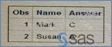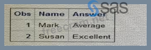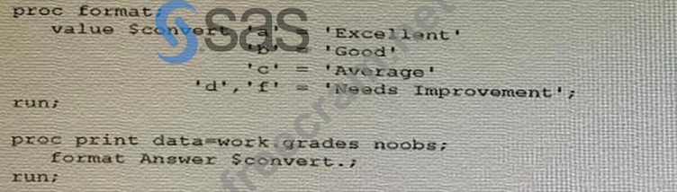 When defining custom formats in SAS, it's important to adhere to the correct syntax, which includes ending format names with a period. In the submitted program, the format $convert is defined without a period at the end of the format name in the VALUE statement. This is likely causing an error since format names in the VALUE statement should always end with a period. Option C correctly identifies that adding a period to the end of the format name on the VALUE statement will allow SAS to properly recognize and apply the custom format to the Answer variable when the PROC PRINT step is executed. The program provided in the question seems to have formatting errors, but based on the information provided, the suggested change is to add a period to make it $convert. which would correctly apply the format. The other options would not resolve the issue of applying the custom format: * A. Changing the case of the unformatted values will not help if the format is not correctly specified. * B. The comma does not seem to be the issue based on the context given. * D. The dollar sign is correct and necessary for character formats; removing it would cause the format to be invalid for character data. References: * SAS 9.4 documentation for the FORMAT procedure: SAS Help Center: PROC FORMAT