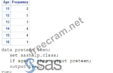 The code creates two datasets, preteen and teen, based on the age variable from the sashelp.class dataset. The if statement checks each observation, and if the age is less than 13, the observation is written to the preteen dataset; otherwise, the observation is written to the teen dataset. From the provided frequency table, we can see that there are 7 observations with ages less than 13 (2 for age 11 and 5 for age 12), so the preteen dataset will have 7 observations. Since the sashelp.class dataset has a total of 19 observations, the remaining 12 observations (19 total - 7 preteen = 12 teen) will be written to the teen dataset. Thus, the answer is: B. preteen will have 7 observations and teen will have 12 observations. References: * SAS documentation on the DATA step and IF-THEN/ELSE logic, SAS Institute.