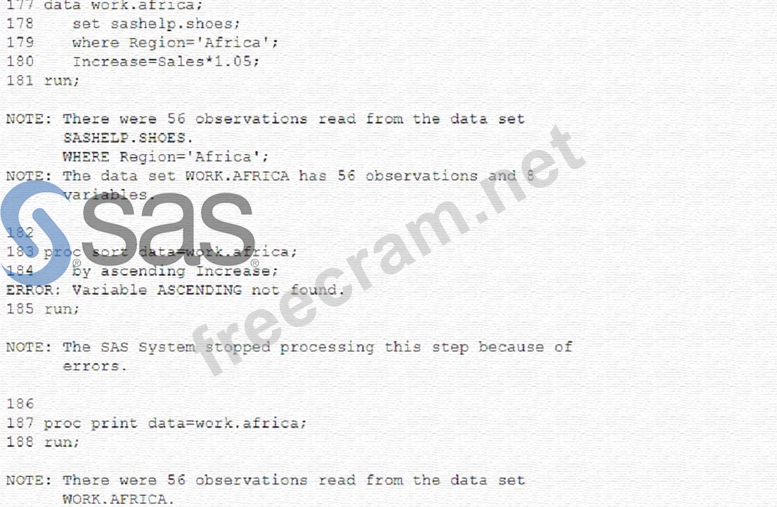 The correct answer is C. The DATA step and PROC PRINT steps ran without errors. In the SAS log shown, there is a clear error in the PROC SORT step because of the use of an incorrect option by ascending Increase which caused the "Variable ASCENDING not found" error. However, the DATA step completed successfully, as indicated by the "NOTE" that follows it, confirming that 56 observations were read from the SASHELP.SHOES data set where Region is Africa. Additionally, the PROC PRINT step also completed successfully, indicated by the "NOTE" at the bottom of the log which confirms that 56 observations were read from the WORK.AFRICA data set, implying the PROC PRINT step executed without issue. A is incorrect because the error in PROC SORT did not cause the program to stop; SAS continued processing the next steps. B is incorrect because the PROC SORT step did not run successfully. D is incorrect because the PROC PRINT step did not fail; it ran successfully. References: * SAS documentation on error messages. * Understanding the SAS log and error messages.