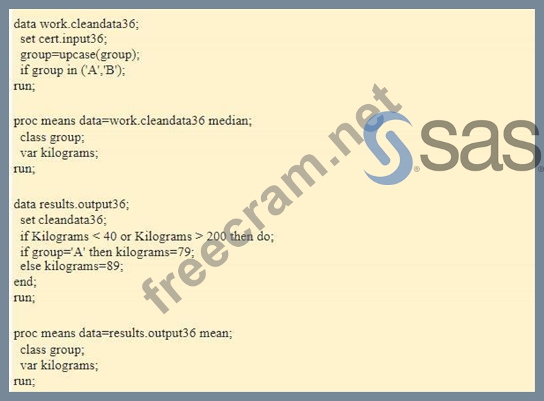Scenario: This project will use data setcert.input36. At any time, you may save your program asprogram36 in cert\programs. Write a SAS program that will clean the data incert.input36as follows: Step 1: create a temporary data set, cleandata36. In this data set, convert all case. Then keep only observations with group equal to 'A' or 'B'. Step 2: Determine the MEDIAN value for the Kilograms variable for each group(A,B) in the cleandata36 data set. Round MEDIAN to the nearest whole number. Step 3: * Create results.output36 from cleandata36 * Ensure that all values for variable Kilogramsare between 40 and 200, inclusively. * If the value is missing or out of range, replace the value with the MEDIAN Kilograms value for the respectivegroup(A,B) calculated in step 2