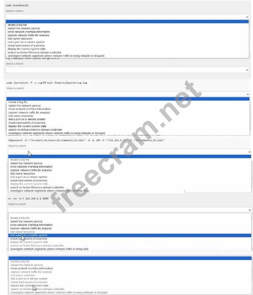 1. sudo timedatectl Purpose: Display the current system date and time. 2. sudo journalctl -f -u ccsd Of tail /home/sailpoint/ccs.log Purpose: Review a log file. This command is used to view logs related to the CCS (Cloud Connector Service) for troubleshooting or analysis. 3. ldapsearch -x -D Purpose: Search an Active Directory domain controller. This command queries an LDAP directory to retrieve information about users, groups, etc. 4. nc -vz -w 5 192.168.0.1 80 Purpose: Test a port on a remote system. This command is using "netcat" to test whether port 80 on the specified IP address is open and responding.
