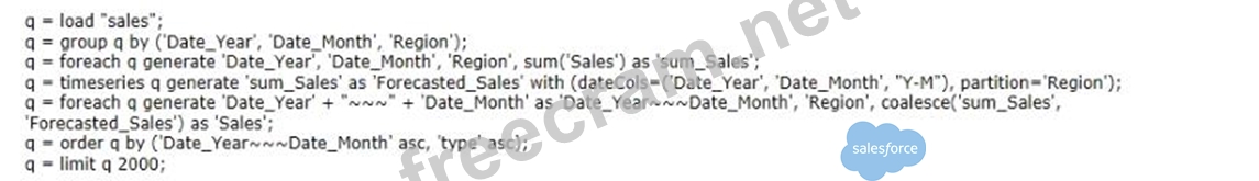 The client is trying to create a SAQL step to predict sales in each sales region. They cannot get the query to return any results, but have identified that the error is in the time series statement. They have asked an Einstein Consultant to review the following query and fix any errors. Which timeseries statement will fix the query'