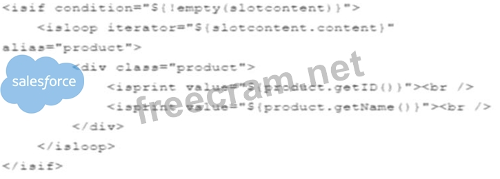 The provided code snippet, which uses an isif and isloop within a template, is perfectly valid within Salesforce B2C Commerce Cloud context, especially when rendering products from a content slot that has been set to a "product" content type. Here's why: * Template and Content Slot Configuration: The content slot configuration specifies that the content type is set to "product" and it is associated with a specific template (slots/product/product_1x2 isml). This indicates that the slot is intended to display product information, which matches the data type expected by the template. * Use of isloop: The isloop is used to iterate over the content of the slot, which in this case, consists of product data. The iterator $(slotcontent.content) suggests that multiple products can be configured within this slot and the template is set up to handle multiple entries. This is a common practice when a slot is configured to display multiple items, such as products in a promotional section or a product list. * Template Syntax: The template uses ISML tags (isif, isloop, isprint) correctly. The isif condition checks if the slot content is not empty, ensuring that the loop only runs when there is content to display. Each product's ID and name are fetched and displayed using isprint, which is appropriate for rendering text data on a page. * No Need for Recommender: The suggestion that a recommender is required (Option C) is incorrect in this context because the slot configuration and template logic do not necessitate any specific recommender setup. A recommender would be used if dynamic product recommendations were needed, but this setup appears to be designed to display predefined products configured within the content slot. * Loop Usage in Slots: The claim in Option B that loops are not allowed in content slot rendering templates is incorrect. Loops are often used in templates to iterate over collections of items, such as products in a slot, particularly when the content slot is intended to handle multiple elements. In summary, no additional action is required for the slot and template to work as intended, based on the information provided and standard practices within Salesforce B2C Commerce Cloud. The setup using isloop within a product content slot is standard and intended to display multiple products. Hence, the answer is A - The content slot is rendered correctly.