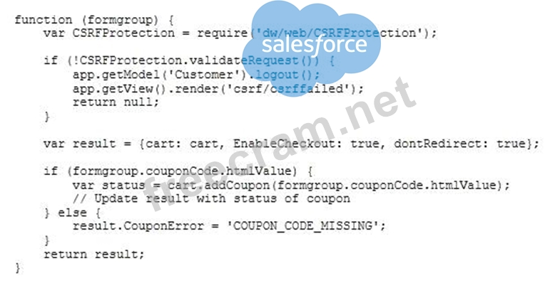 Universal Containers recently completed updates to their storefront shopping cart page. A problem has been discovered since the update. Users are no longer able to submit coupon codes on this page. Additionally, authenticated userswho try to add a coupon are logged out. The following processing code is found in the Cart.js controller file: What should the Developer verify to identify the issue?