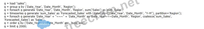 The client is trying to create a SAQL step to predict sales in each sales region. They cannot get the query to return any results, but have identified that the error is in the time series statement. They have asked an Einstein Consultant to review the following query and fix any errors.