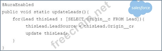 The following code snippet is executed by a Lightning web component in an environment with more than 2,000 lead records: