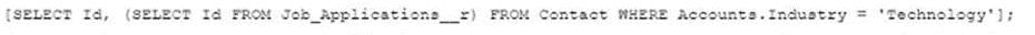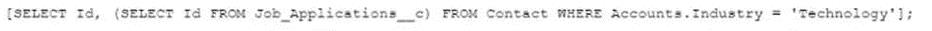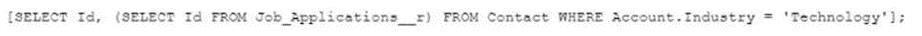 The Job_application_ c custom object has a field that is a master-detail relationship to the Contact object, where the Contact object is the master. As part of a feature implementation, a developer needs to retrieve a list containing all Contact records where the related Account Industry is 'Technology', while also retrieving the Contact's Job_Application__c records. Based on the object's relationships, what is the most efficient statement to retrieve the list of Contacts?