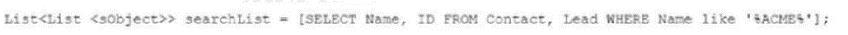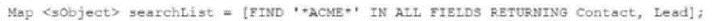 Which statement generates a list of Leads and Contacts that have a field with the phrase 'ACME'?
