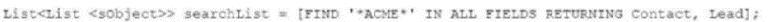 List<List<SObject>> searchList = [FIND 'ACME' IN ALL FIELDS RETURNING Contact, Lead]; This query retrieves a list of SObject lists, where each inner list contains the results for a specific object (e.g., Contact or Lead).