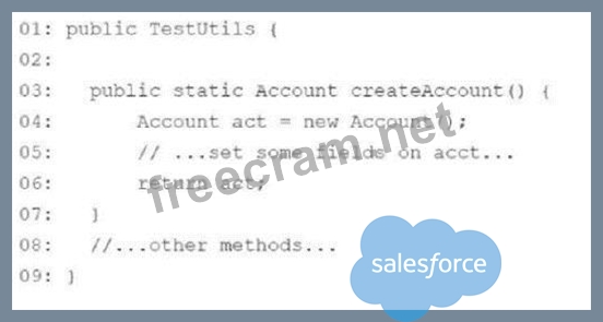 To ensure that the TestUtils class and its methods are only accessible by unit test methods, the class must be annotated with the @isTest annotation. This annotation limits the scope of the class and its methods to test contexts only. Why @isTest? Purpose of @isTest: The @isTest annotation marks a class or method for use exclusively within test scenarios. It prevents the methods from being accidentally invoked in production code. This ensures better test isolation and prevents misuse. Static Test Data Methods: Marking helper methods for test data creation as @isTest ensures they do not interfere with production code and are strictly for testing purposes. Analysis of Options: Option A: @isTest above line 03: Incorrect. Applying @isTest only to the createAccount method would work, but the other methods in the class would still be accessible. This does not satisfy the requirement of restricting the entire class. Option B: Add @isTest above line 01: Correct. Annotating the class ensures all methods within the class are accessible only in the context of tests. Option C: Change public to private on line 01: Incorrect. Changing the class to private would cause a compilation error, as top-level classes in Salesforce cannot be declared private. Option D: Remove static from line 03: Incorrect. Removing static does not affect the test scope of the class or its methods. Static methods can still be invoked, and this does not restrict access to test contexts. Correct Implementation: The corrected code would look like this: @isTest public class TestUtils { public static Account createAccount() { Account acct = new Account(); // Set some fields on acct return acct; } // Other methods... } References: Apex Testing: Test Classes and Methods Trailhead Module on Apex Testing