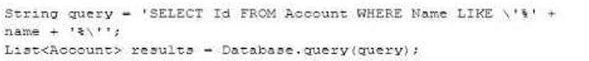 Assuming that name is a String obtained by an <apex:inpucText> tag on a Visualforce page, which two SOQL queries performed are safe from SOQL injection? Choose 2 answers