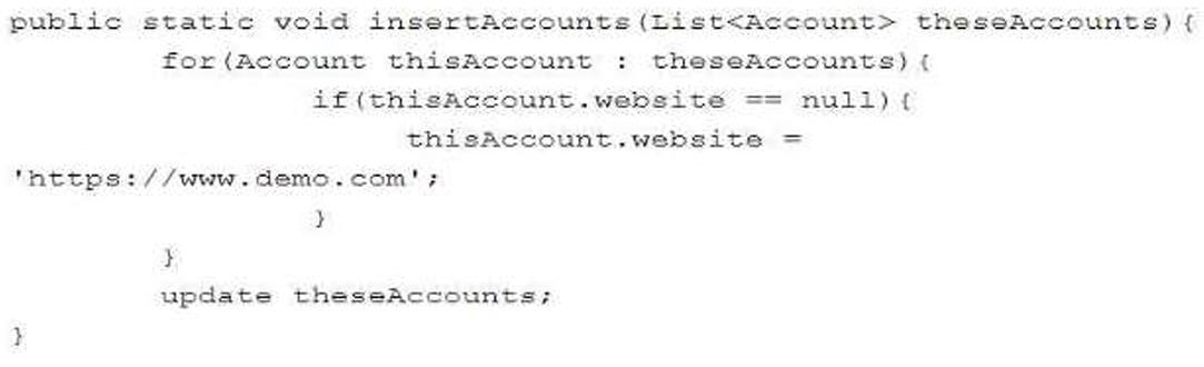 Understanding the Issue: The provided code attempts to update a list of Account records: public static void insertAccounts(List<Account> theseAccounts) { for(Account thisAccount : theseAccounts) { if(thisAccount.website == null) { thisAccount.website = 'https://www.demo.com'; } } update theseAccounts; } Problem: A DML exception is thrown when the update statement executes. Possible Causes: Some records in theseAccounts may have validation rule failures. There may be null records within the theseAccounts list. There could be fields that violate data integrity constraints. Option Analysis: Option A: Implement Change Data Capture Modified Code: public static void insertAccounts(List<Account> theseAccounts) { for(Account thisAccount : theseAccounts) { if(thisAccount.website == null) { thisAccount.website = 'https://www.demo.com'; } } try { update theseAccounts; } catch (DmlException e) { // Handle exception, e.g., log error or process partial successes System.debug('A DML exception occurred: ' + e.getMessage()); } } Modified Code: theseAccounts.removeAll(null); Reference: Why Not Suitable: CDC is unrelated to handling exceptions in Apex code. It does not help in gracefully handling DML exceptions. Option B: Implement a try/catch block for the DML Apex Developer Guide - Exception Handling Apex Developer Guide - DmlException Class Why Suitable: Graceful Handling: By catching the DmlException, the code can handle the error without abruptly terminating the execution. Logging and Recovery: Allows the developer to log the exception details and potentially implement recovery logic. Option C: Implement the upsert DML statement Why Not Suitable: The issue is not about distinguishing between insert or update operations. Using upsert does not inherently handle exceptions; DML exceptions can still occur. It does not address handling exceptions gracefully. Option D: Remove null items from the list of Accounts Why Partially Suitable: If null records are causing issues, removing them can prevent exceptions. However, the question specifies a DML exception, not a NullPointerException. Removing null items does not handle other potential DML exceptions (e.g., validation rule failures). Conclusion: Best Solution: Option B is the most appropriate choice. Wrapping the DML statement in a try/catch block ensures that any exceptions thrown during the DML operation are caught and can be handled gracefully. This approach aligns with best practices for exception handling in Apex. Additional Recommendation: Using Database.update with allOrNone=false: Database.SaveResult[] results = Database.update(theseAccounts, false); for (Database.SaveResult sr : results) { if (!sr.isSuccess()) { // Handle individual record failure System.debug('Error updating record: ' + sr.getErrors()[0].getMessage()); } } Benefit: Allows partial success processing, handling errors at the record level.