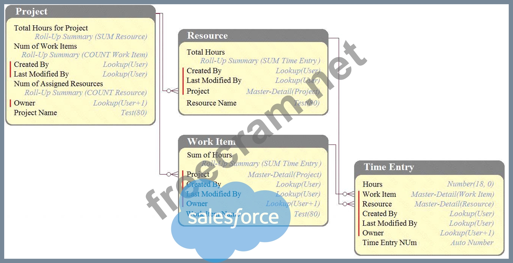DreamHouse Realty has a data model as shown in the image. The Project object has a private sharing model, and it has Roll-Up summary fields to calculate the number of resources assigned to the project, total hours for the project, and the number of work items associated to the project. There will be a large amount of time entry records to be loaded regularly from an external system into Salesforce. What should the Architect consider in this situation?