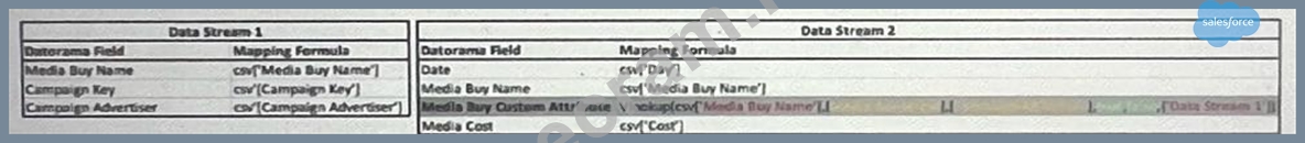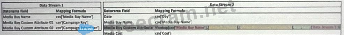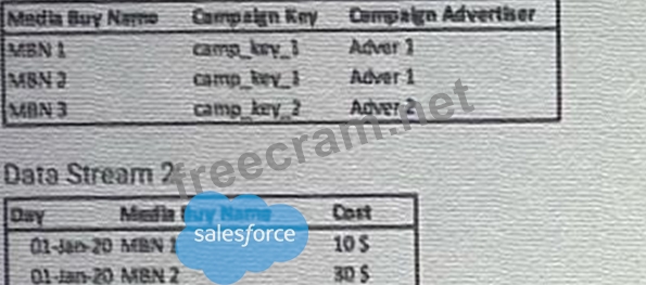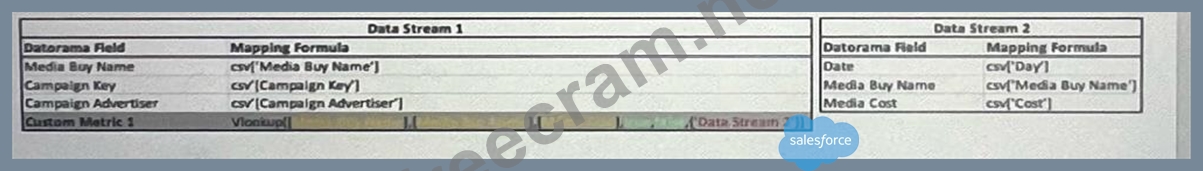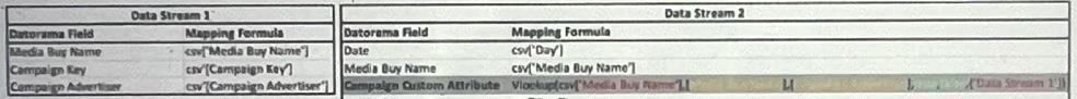 A client provides the following two data streams: Data Stream 1: Question- The client would like to use a VLOOKUP formula to calculate the Cost per Campaign Advertiser on January 1st 2020. Which mapping options should the client apply to obtain the expected result?