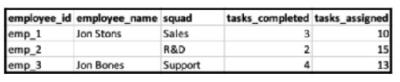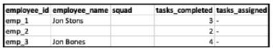 Hence, when filtering on the entire date range (1-30/8), the resulting view will align with the structure of the parent data stream, showing the KPIs ('Tasks Completed' from File A and 'Tasks Assigned' from File B) alongside the employee names and squads from the respective files. Since the employee IDs align, the data can be linked properly. However, since the dates do not align (File A data is from 01/08/2019 and File B from 15/08/2019), only attributes from File B will be updated without date association.