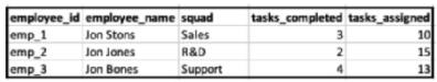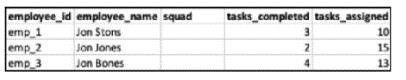 When filtering on the entire date range (1-30/8), and querying employee ID, Name and Squad with the two measurements - what will the result look like?