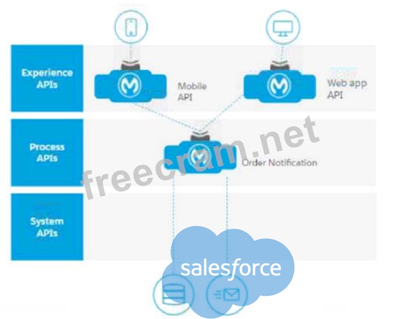In this scenario, the best approach to satisfy the API-led connectivity principles and support future scalability is: Experience APIs: Create separate Experience APIs for the web application and the mobile application. This allows each application to have an optimized interface, supporting different needs and potential differences in request/response structures or security configurations. Process API: A single Process API can be used to orchestrate the workflow, including retrieving the email template from a database and preparing the email content. By centralizing this logic in the Process layer, we can ensure it is reusable and easily adaptable for different notification channels in the future. System API: A System API specifically designed for sending emails (using the Anypoint Connector for Email) abstracts the email-sending functionality from the business logic. This approach ensures that the email-sending function is reusable and scalable, and it can easily be extended or modified if other notification channels (like SMS or push notifications) are added later. Why Option A is Correct: This structure aligns with API-led connectivity principles by separating concerns across Experience, Process, and System layers. It provides flexibility for future notification channels and isolates each layer's responsibility, making it easier to maintain and scale. of Incorrect Options: Option B lacks a separate System API for sending emails, which goes against the principle of isolating back-end functionality in System APIs. Option C similarly lacks a dedicated System API, reducing flexibility and reusability. Option D suggests creating multiple Process APIs for database retrieval, which adds unnecessary complexity and does not adhere to the single-orchestration principle typically followed in API-led design. Reference For further guidance on API-led connectivity and the responsibilities of each API layer, refer to MuleSoft's documentation on API-led architecture and design best practices.