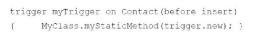 A developer created this Apex trigger that calls Myclass.myStaticMethod: