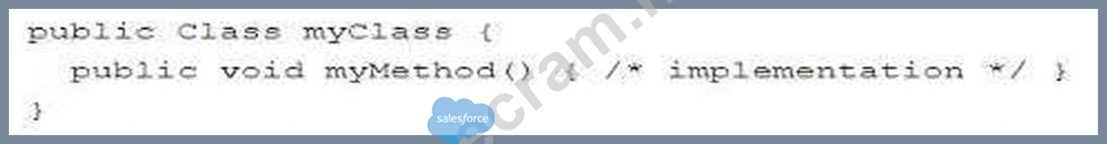In the provided class: public class myClass { public void myMethod() { /* implementation */ } } The class myClass is declared without any sharing keyword (with sharing, without sharing, or inherited sharing). Default Sharing Behavior: Apex classes without an explicit sharing declaration run in system context, meaning they do not enforce sharing rules. Option B: Sharing rules will not be enforced for the running user. Reference: "If a class is not declared as either with sharing or without sharing, the class does not enforce sharing rules except when it acquires sharing rules from another class." - Apex Developer Guide: Using the with sharing or without sharing Keywords Why Other Options Are Incorrect: Option A: Sharing rules are not inherited from the calling context unless inherited sharing is used. Option C: There is no instantiating class that enforces sharing in this context. Option D: Sharing rules are not enforced unless with sharing is specified.