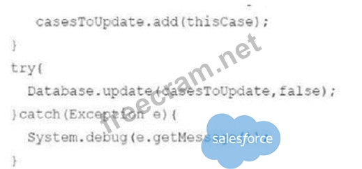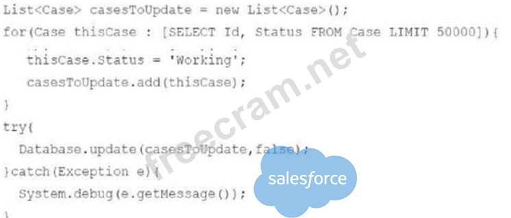 The code provided processes allCaserecords in a single transaction. Since it attempts to process over 10,000 records, it exceeds the Salesforce governor limit of 50,000 DML rows per transaction, causing the transaction to fail. * Governor Limits on DML Rows (C):Salesforce enforces a governor limit of 50,000 rows for DML operations per transaction. In this case, if theSELECTquery retrieves over 50,000 records, theDatabase. updatecall will hit this limit and throw aSystem.LimitException. Reference:Apex Governor Limits Why the Try-Catch Block Fails to Handle Limits (B & D):Governor limit exceptions (System. LimitException) cannot be caught by try-catch blocks. Therefore, the exception cannot be handled, and the transaction will fail.