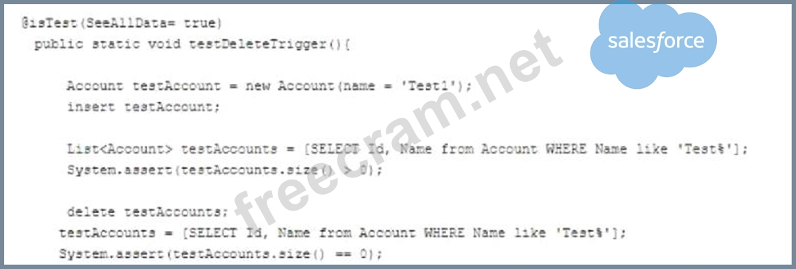 Ans is B. becoz of (seeAllData=true) in the first assert it has 6 records along with the original records and testclass dummy record. after delet all records will be deleted but not inside the org. So i wont throw the error the record size will be zero so the second assert also succeed.