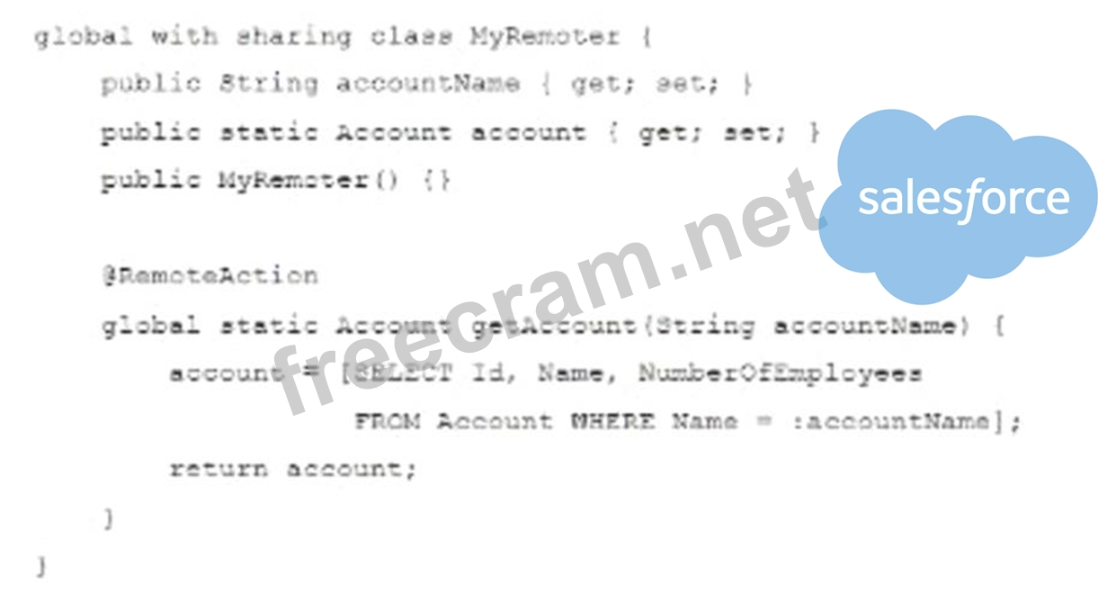 Question 86: Consider the Apex class below that defines a RemoteAction us...