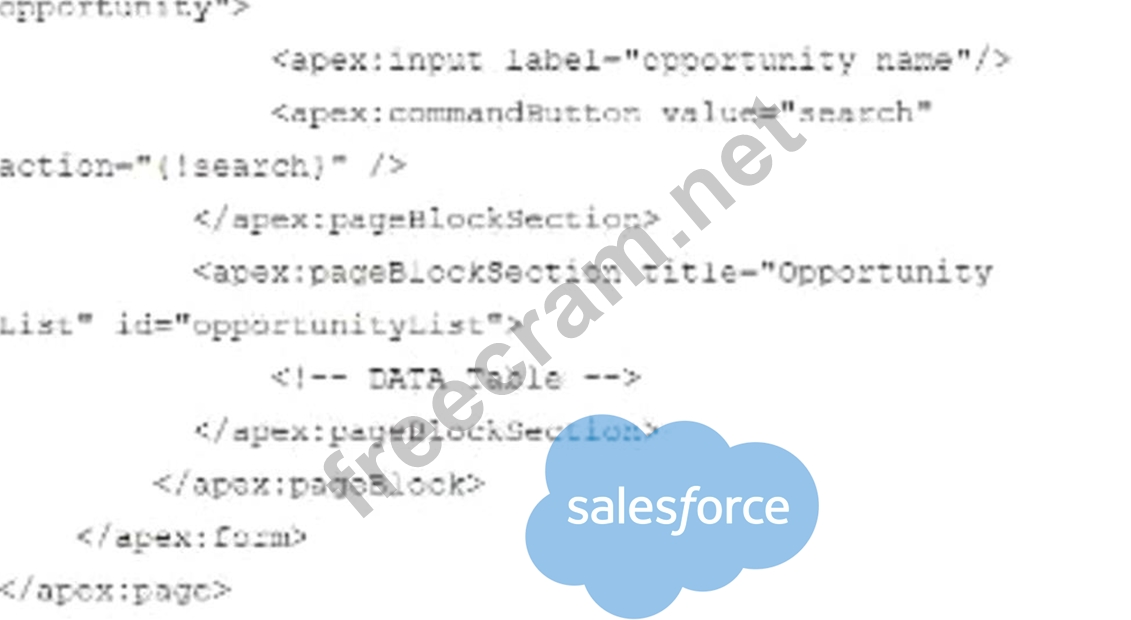 Refer to the exhibit Users of this Visualforce page complain that the page does a full refresh every time the Search button Is pressed. What should the developer do to ensure that a partial refresh Is made so that only the section identified with opportunity List is re-drawn on the screen?