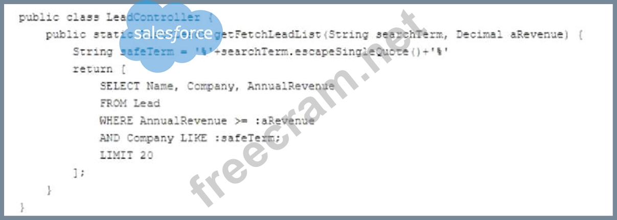 Refer to the following code snippet: A developer created a JavaScript function as part of a Lightning web component (LWC) that surfaces information about Leads by wire calling geyFetchLeadList whencertain criteria are met. Which three changes should the developer implement in the Apex class above to ensure the LWC can display data efficiently while preserving security? Choose 3 answers