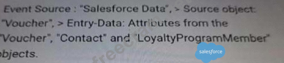 Option C is the most suitable choice because it specifies an entry event based on the "Voucher," "Contact," and "LoyaltyProgramMember" objects. This approach aligns with the requirements because it directly utilizes the "first name" from the Contact object and the "membership number" from the LoyaltyProgramMember object, which are necessary for personalizing the notification message.