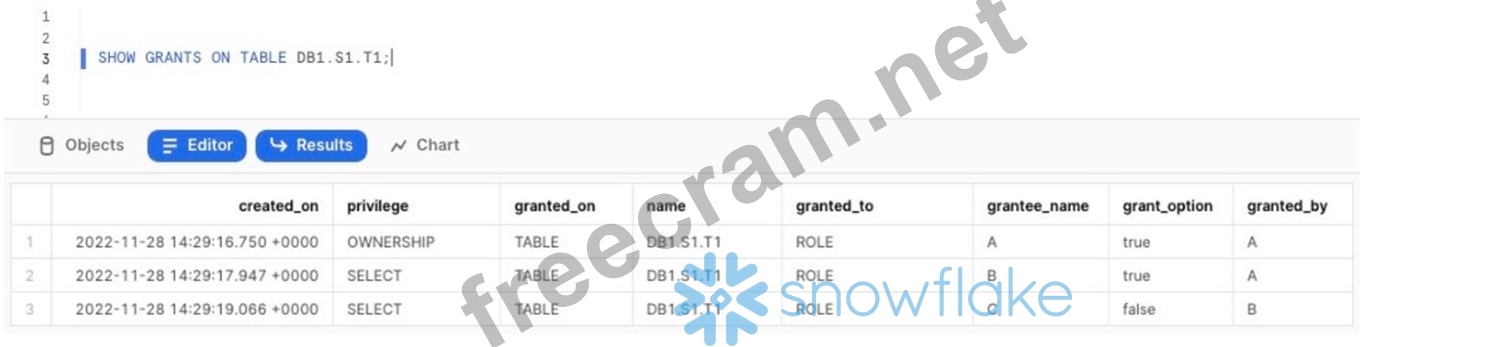Dropping role A does not affect the SELECT privileges granted to roles B and C on the table DB1.S1.T1. According to the Snowflake documentation, dropping a role revokes all privileges granted to the role, but does not revoke any privileges granted by the role. Therefore, the OWNERSHIP privilege on the table DB1.S1.T1 will be revoked from role A, but the SELECT privileges granted by role A to role B and by role B to role C will remain. The GRANTED_BY column will still show the original grantor of the privilege, not the ACCOUNTADMIN role.