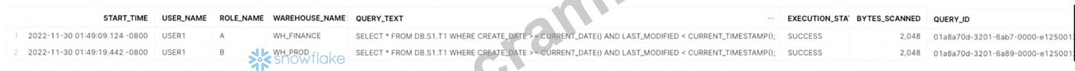 Explanation The inclusion of the CURRENT_TIMESTAMP() function in the second query prevents it from re-using the first query's persisted result cache because this function makes each execution unique due to the constantly changing timestamp. According to the Snowflake documentation, "The query does not include non-reusable functions, which return different results for successive runs of the same query. UUID_STRING, RANDOM, and RANDSTR are good examples of non-reusable functions." The CURRENT_TIMESTAMP() function is another example of a non-reusable function, as it returns the current date and time at the start of query execution, which varies for each run. Therefore, the second query is not identical to the first query, and the result cache is not reused. The other options are either incorrect or irrelevant to the question. Option B is incorrect, as the CURRENT_DATE() function is a reusable function, as it returns the same value for all queries executed within the same day. Option C is irrelevant, as the virtual warehouse used to execute the query does not affect the result cache reuse. Option D is also irrelevant, as the role used to execute the query does not affect the result cache reuse, as long as the role has the necessary access privileges for all the tables used in the query.