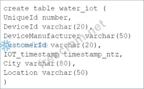 A clustering key is a subset of columns or expressions that are used to co-locate the data in the same micro-partitions, which are the units of storage in Snowflake. Clustering can improve the performance of queries that filter on the clustering key columns, as it reduces the amount of data that needs to be scanned. The best choice for a clustering key depends on the query patterns and the data distribution in the table. In this case, the columns DeviceId, IOT_timestamp, and CustomerId are frequently used in the filter predicate for the select statement, which means they are good candidates for the clustering key. The columns City and DeviceManufacturer are often retrieved, but not filtered on, so they are not as important for the clustering key. The column UniqueId is used for counting, but it is not a good choice for the clustering key, as it is likely to have a high cardinality and a uniform distribution, which means it will not help to co-locate the data. Therefore, the best option is to use DeviceId and CustomerId as the clustering key, as they can help to prune the micro-partitions and speed up the queries. References: Clustering Keys & Clustered Tables, Micro-partitions & Data Clustering, A Complete Guide to Snowflake Clustering