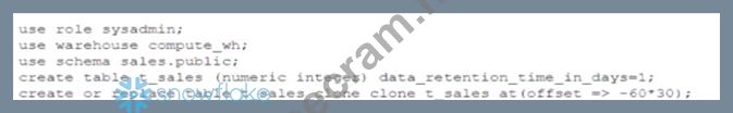 The query is executing a clone operation on an existing tablet_saleswith an offset to account for the retention time. The syntax used is correct for cloning a table in Snowflake, and the use of theat(offset => -60*30)clause is valid. This specifies that the clone should be based on the state of the table 30 minutes prior (60 seconds * 30). Assuming the tablet_salesexists and has been modified within the last 30 minutes, and considering the data_retention_time_in_daysisset to 1 day (which enables time travel queries for the past 24 hours), the table t_sales_clonewould be successfully created based on the state oft_sales30 minutes before the clone command was issued.