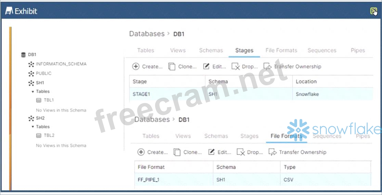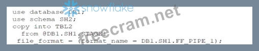 Option B: Use a named external stage that references STAGE1. This option requires creating an external stage object in DB2.SH2 that points to the same location as STAGE1 in DB1.SH1. The external stage can be created using the CREATE STAGE command with the URL parameter specifying the location of STAGE11. For example: