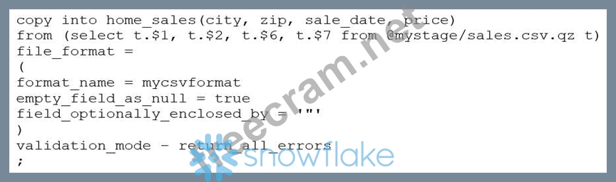* The VALIDATION_MODE parameter is used to specify the behavior of the COPY statement when loading data into a table. It is used to specify whether the COPY statement should return an error if any of the rows in the file are invalid or if it should continue loading the valid rows. The VALIDATION_MODE parameter is only supported for COPY statements that load data from external stages1. * The query in the question uses a data transformation query to load data from an internal stage. A data transformation query is a query that transforms the data during the load process, such as parsing JSON or XML data, applying functions, or joining with other tables2. * According to the documentation, VALIDATION_MODE does not support COPY statements that transform data during a load. If the parameter is specified, the COPY statement returns an error1. Therefore, option C is the correct answer. References: : COPY INTO <table> : Transforming Data During a Load