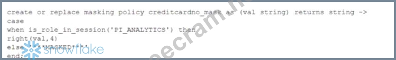 * The masking policy defined in the image indicates that if a user has the PI_ANALYTICS role, they will be able to see the last 4 characters of the CREDITCARDNO column data in clear text. Otherwise, they will see 'MASKED'. Since Snowflake system roles have not been granted any additional roles, they won't have the PI_ANALYTICS role and therefore cannot view the last 4 characters of credit card numbers. * To apply a masking policy on a column in Snowflake, you need to use the ALTER TABLE ... ALTER COLUMN command or the ALTER VIEW command and specify the policy name. For example, to apply the creditcardno_mask policy on the CREDITCARDNO column of the CREDITCARDINFO table, you can use the following command: ALTER TABLE CREDITCARDINFO ALTER COLUMN CREDITCARDNO SET MASKING POLICY creditcardno_mask; * For more information on how to create and use masking policies in Snowflake, you can refer to the following resources: CREATE MASKING POLICY: This document explains the syntax and usage of the CREATE MASKING POLICY command, which allows you to create a new masking policy or replace an existing one. Using Dynamic Data Masking: This guide provides instructions on how to configure and use dynamic data masking in Snowflake, which is a feature that allows you to mask sensitive data based on the execution context of the user. ALTER MASKING POLICY: This document explains the syntax and usage of the ALTER MASKING POLICY command, which allows you to modify the properties of an existing masking policy. References: 1: https://docs.snowflake.com/en/sql-reference/sql/create-masking-policy 2: https://docs.snowflake.com/en/user-guide/security-column-ddm-use 3: https://docs.snowflake.com/en/sql-reference/sql/alter-masking-policy