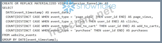 Option C is the most efficient and scalable. A Snowflake Stream allows you to track changes to the 'website_events' table in real- time. A Snowpipe enables continuous data ingestion. A materialized view pre-calculates the conversion funnel metrics, significantly improving query performance compared to querying the base table directly, especially with high data volumes. Connecting a real-time dashboarding tool to the materialized view provides a real-time view of the funnel. Option A involves periodic querying, which is less real-time and less efficient. Option B suggests direct connection with a BI tool without pre-aggregating the Data, resulting into dashboard performance issue. Option D introduces unnecessary complexity with external message queues and stream processing frameworks. Exporting data to Python dataframe is not scalable for large data volumes.