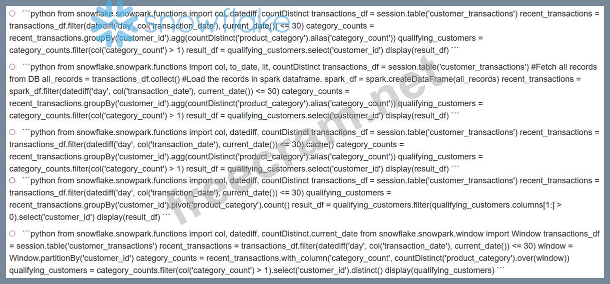 Option E is the most efficient. It filters the transactions within the last 30 days, uses a window function to calculate the distinct count of product categories per customer, and then filters to identify customers with more than one category. The use of window functions allows the aggregation to happen within Snowflake, minimizing data transfer and leveraging Snowflake's processing power. distinct at the end makes it unique.