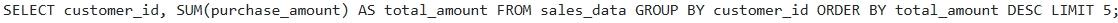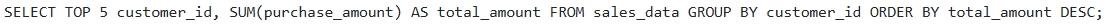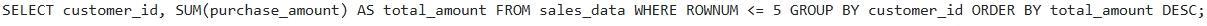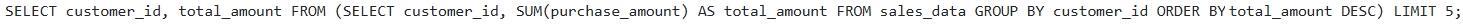 A data analyst is using the Snowflake web UI worksheet to explore data in a table named They want to retrieve the top 5 customers by total purchase amount. Which of the following SQL queries, executed directly within the worksheet, will achieve this, assuming identifies the customer and represents the amount of each purchase?